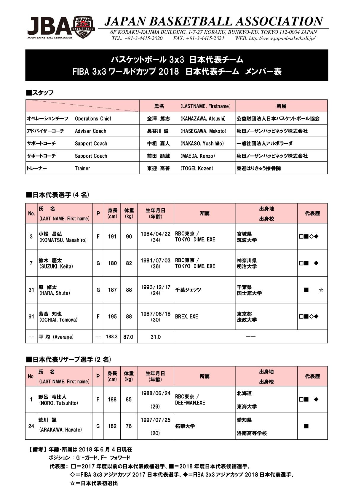 3×3男子日本代表チーム“FIBA 3×3 ワールドカップ2018”日本代表選手発表