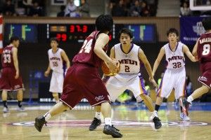 明治大は#2齋藤(写真)を軸にオールコートプレスを仕掛け、粘りを見せたがあと一歩及ばず。