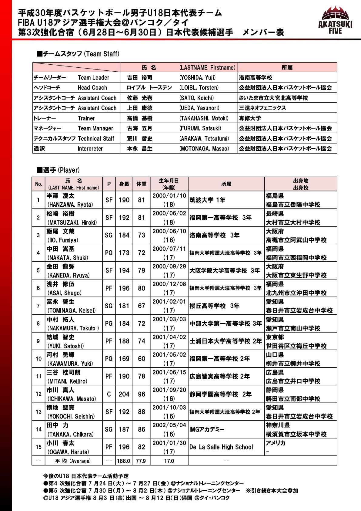 平成30年度“男子U18日本代表チーム ”第3次強化合宿日本代表候補選手メンバー発表