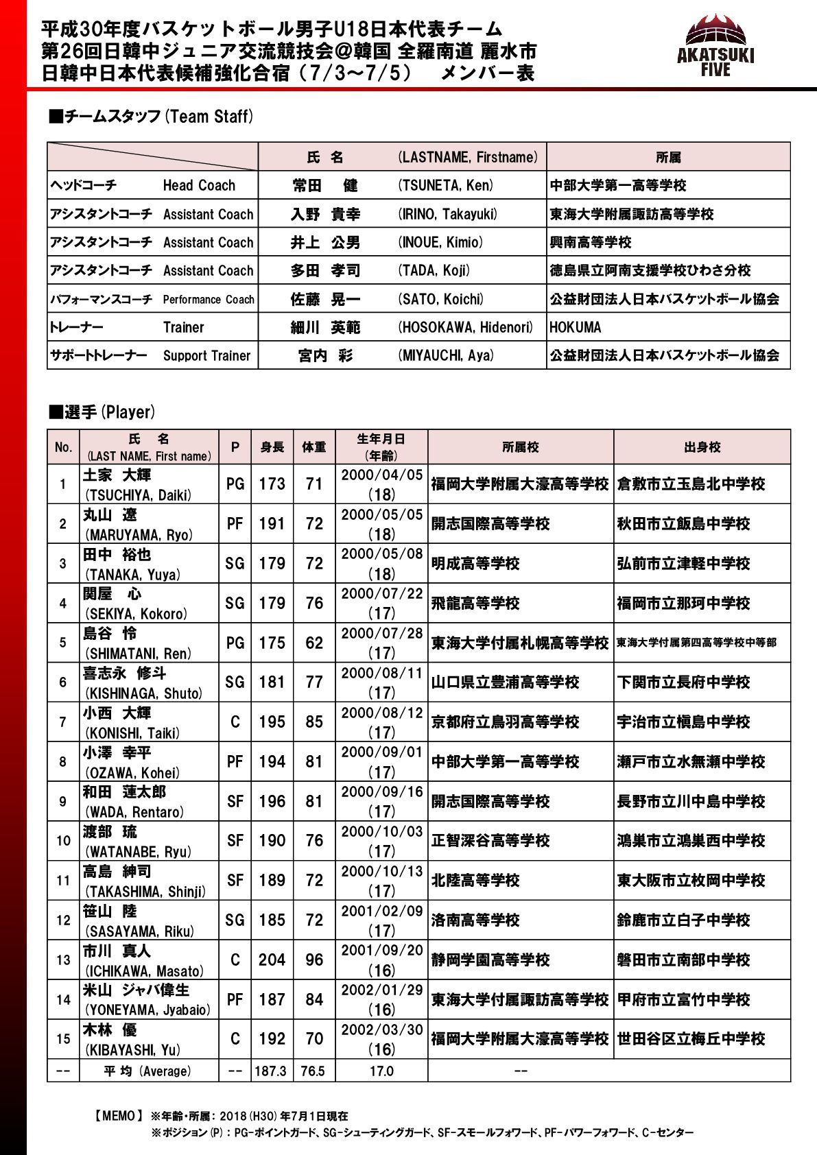 平成30年度“U18日本代表チーム(第26回日韓中ジュニア交流競技会日本代表)”候補強化合宿参加メンバー発表