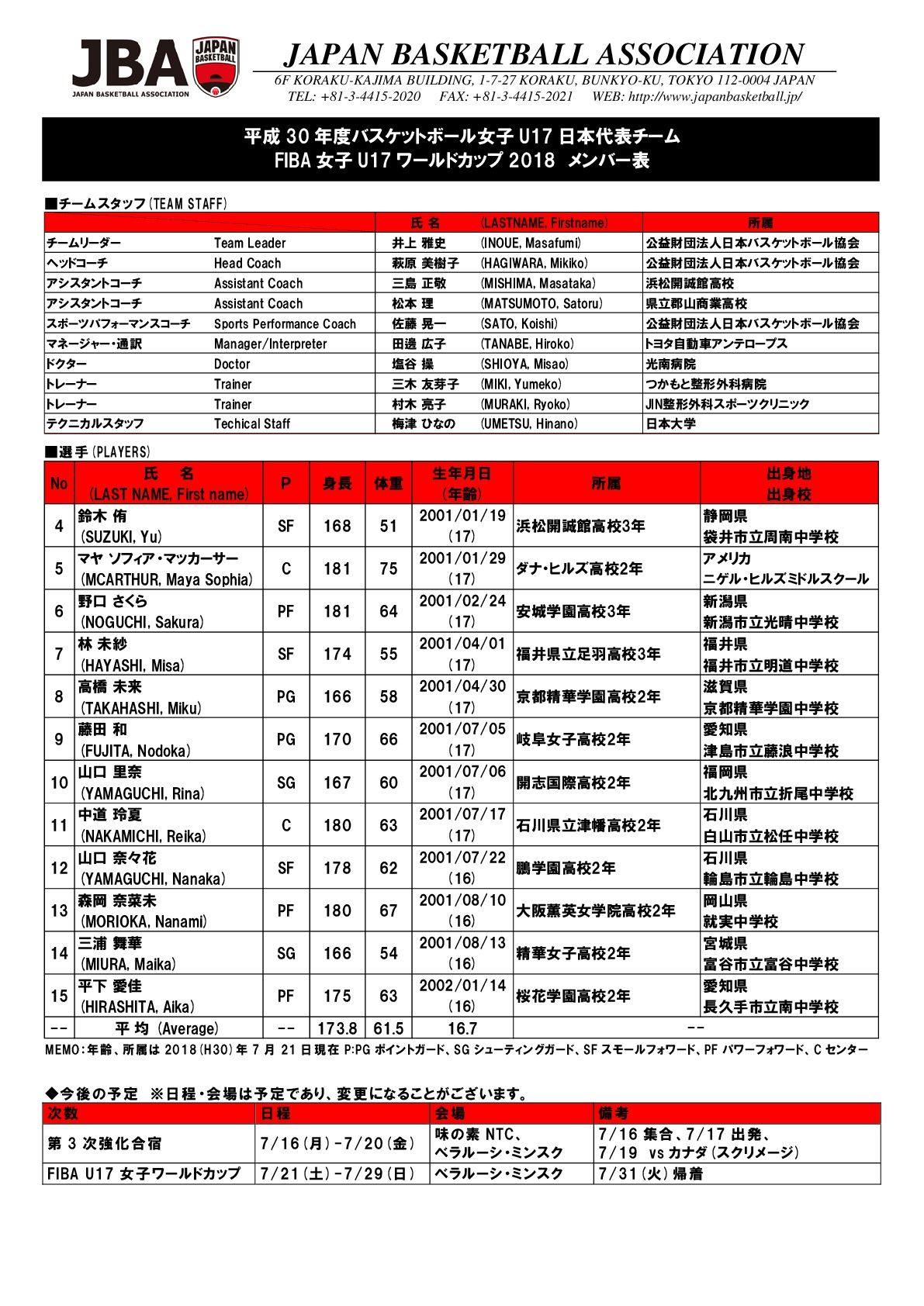 平成30年度女子U17日本代表チーム“FIBA女子U17ワールドカップ2018”日本代表選手発表