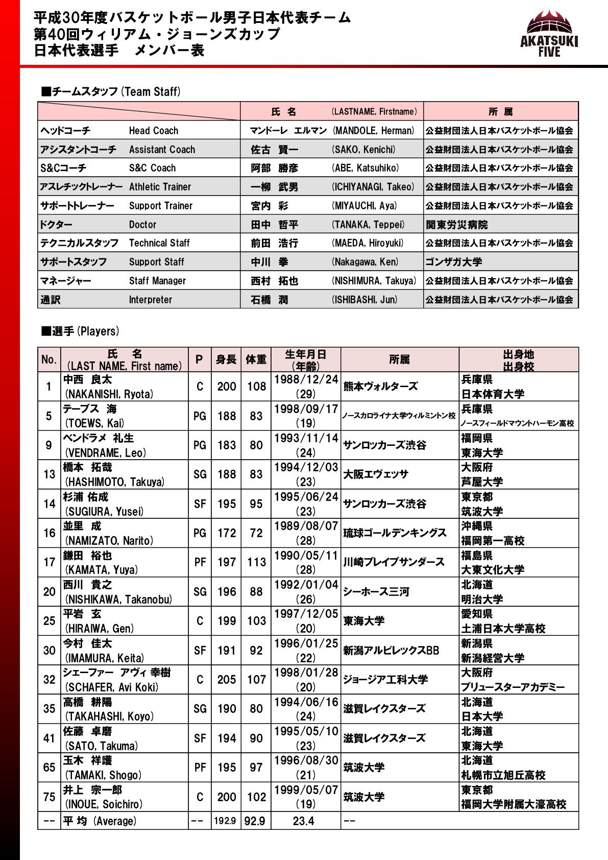 平成30年度バスケットボール日本代表チーム“第40回ウィリアム・ジョーンズ カップ2018”男女日本代表選手発表