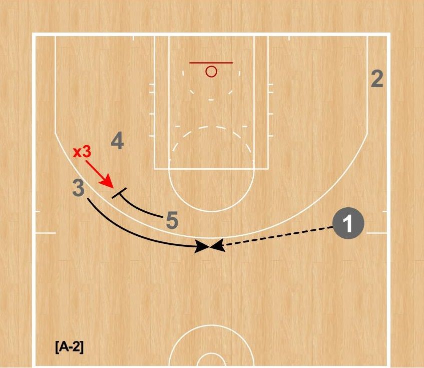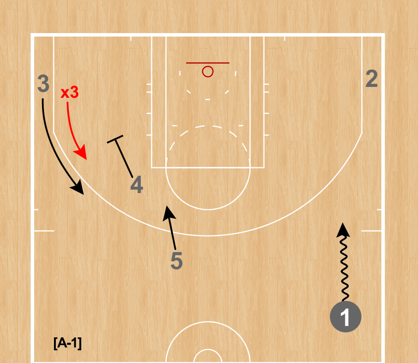 [A-1] ①が右側をボールキャリー、③(渡邊)と②は左右コーナー、④と⑤はファースト&セカンドトレーラーで入ってくるところから始まる。 ④が左コーナーの③(渡邊)にダウンスクリーンをセット。⑤もスタッガードになるためにスクリーンを仕掛けに行く。③(渡邊)にマッチアップしているX3は④の左を通ってきた。