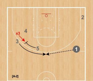 [A-2] X3のコースを見た⑤は進路を左へと変え、ダウンスクリーンをセット。③(渡邊)は2つのスクリーンを使ってトップ方向へ。①からのパスをレシーブして3Pシュートを放った。