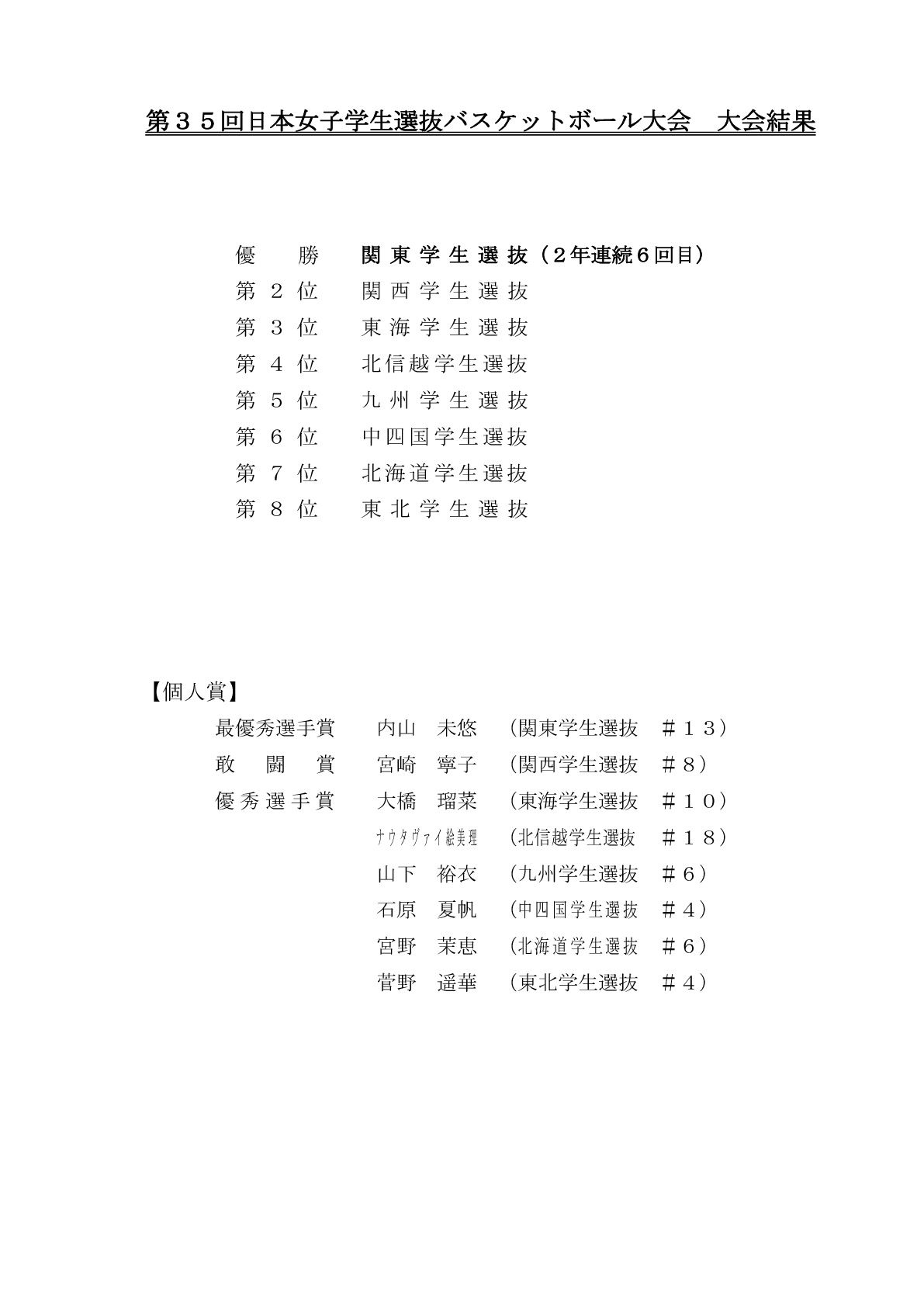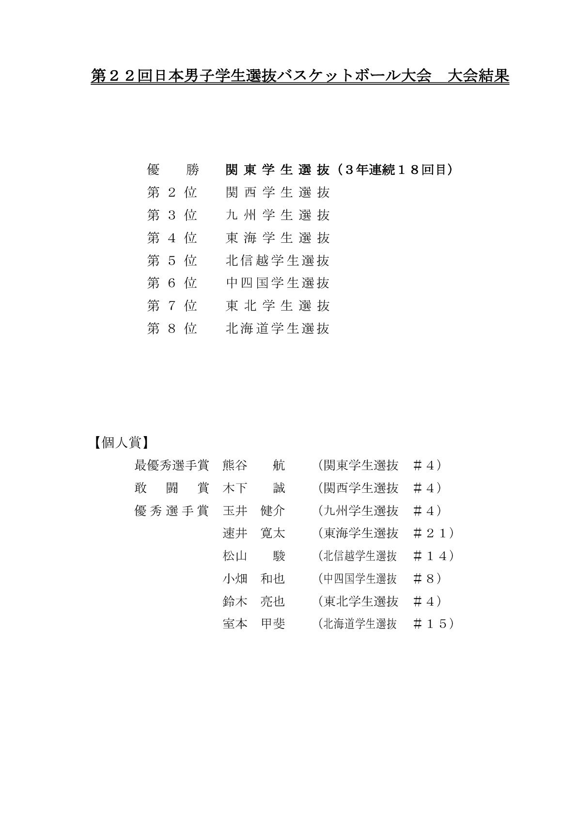 7月6~8日の3日間、スカイホール豊田(豊田市総合体育館/愛知)で開催された“男子第22回・女子第35回日本学生選抜バスケットボール大会”。 各地区選抜チームの熱い戦いを男女ともに関東学生選抜が制した。男子は3年連続18回目、女子は2年連続6回目の優勝。また、男子最優秀選手賞は熊谷(関東#4)、女子は内山未悠(関東#13)が選ばれた。 *男子結果 *男子星取表 *女子結果 *女子星取表 ※詳しくは日本学生選抜バスケットボール大会特設ページへ。 http://www.jubf.jp/game/index/type/senbatsu (月刊バスケットボール)