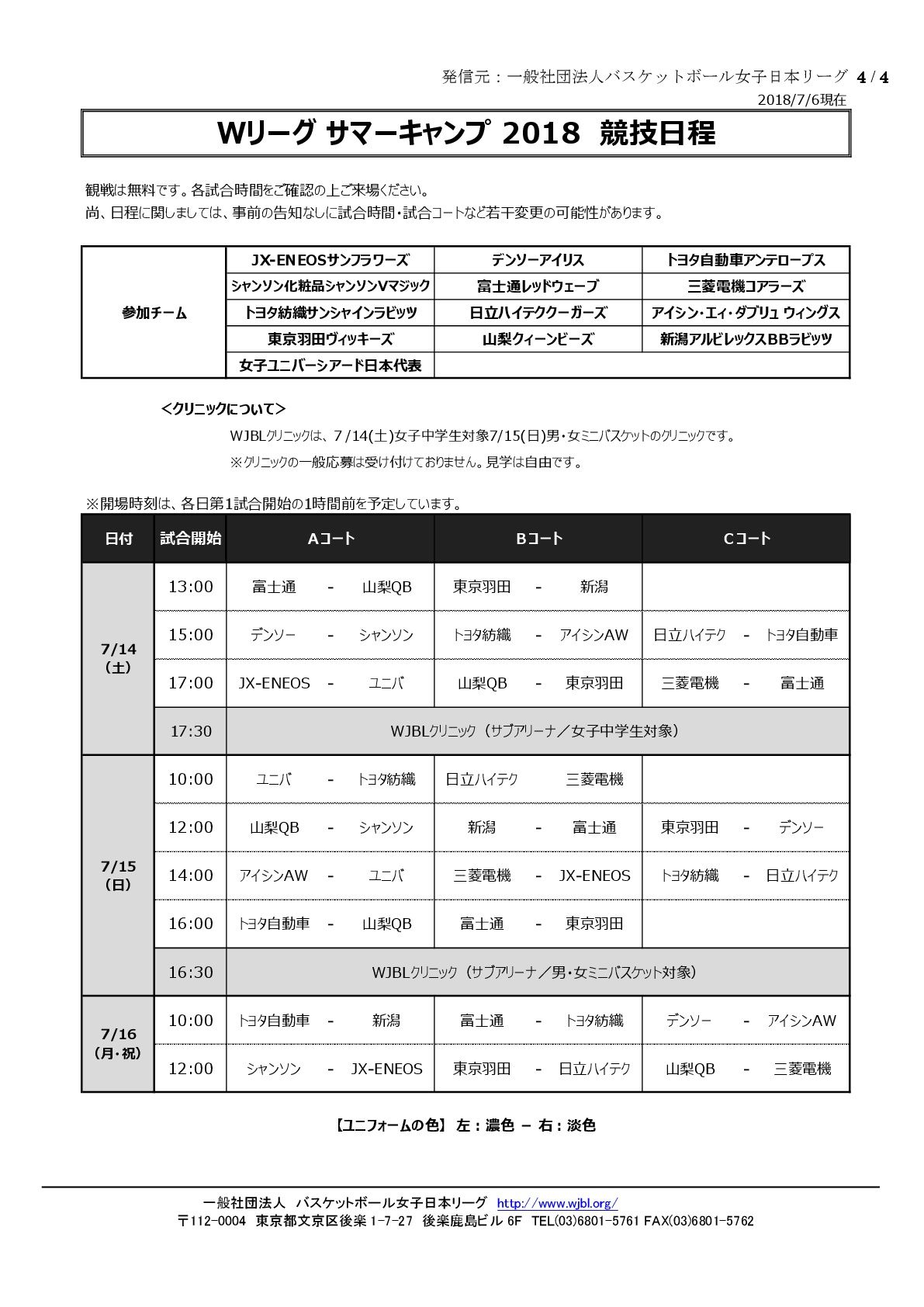 7月14~16日に長崎県大村市にて開催される“Wリーグ サマーキャンプ2018 in 大村”の組み合わせが決定した。