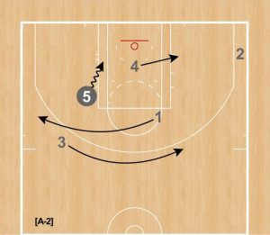 [A-2] ④(渡邉)は反対サイドのローポスト付近へ、①と③もそれぞれ動く。スペースができたところで⑤がパワープレイで得点を狙う。 ④(渡邉)が右コーナーへ出てくれば②はウイングへと連動し、①・③・②・④の4人で⑤からのキックアウトに備える。