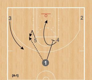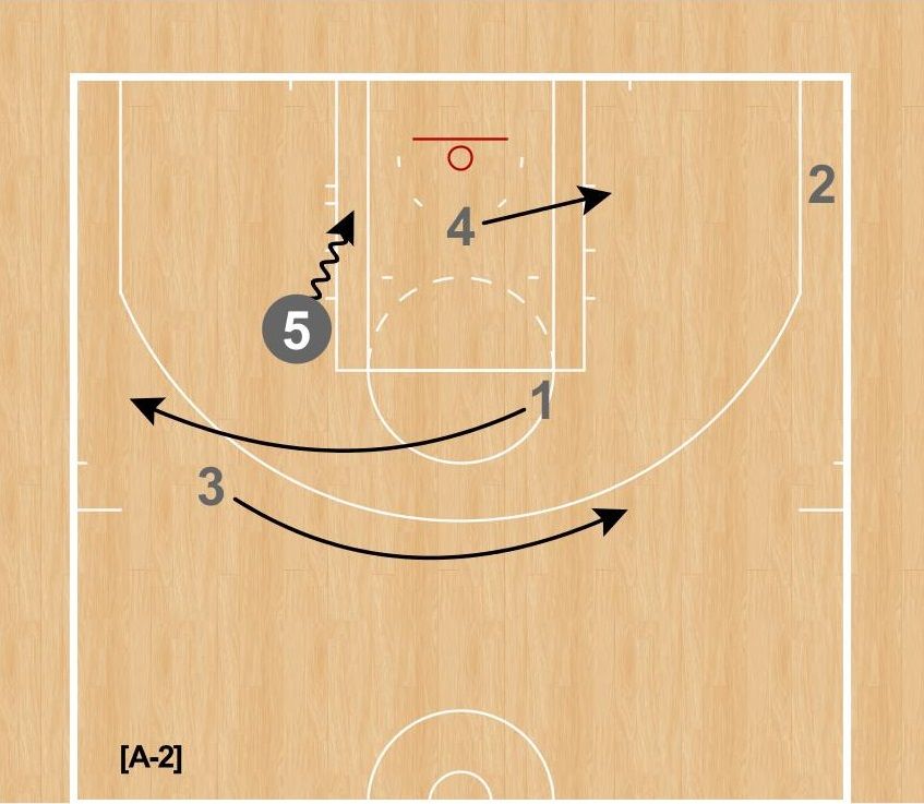 [A-1] 両エルボーに⑤と④(渡邉)、両コーナーに③と②、①がボールを保持してホーンセット開始。 ①は⑤へパスして、④(渡邉)へダウンスクリーンをセット。④(渡邉)はディフェンスがフォローしてきたため、リング方向へカールカットした。③は次の動きを準備し、トップ方向へ。
