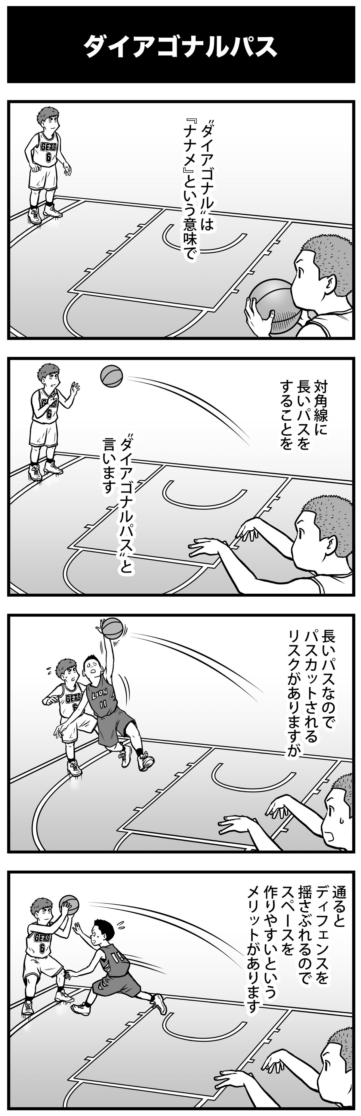月刊バスケットボールで連載中の『まんが バスケットボール用語辞典』をウェブでも読めるように! 和製英語や造語ではなく、正しい英語のニュアンスで理解していくと、より分かりやすくなる。今回は “ダイアゴナルパス”について。