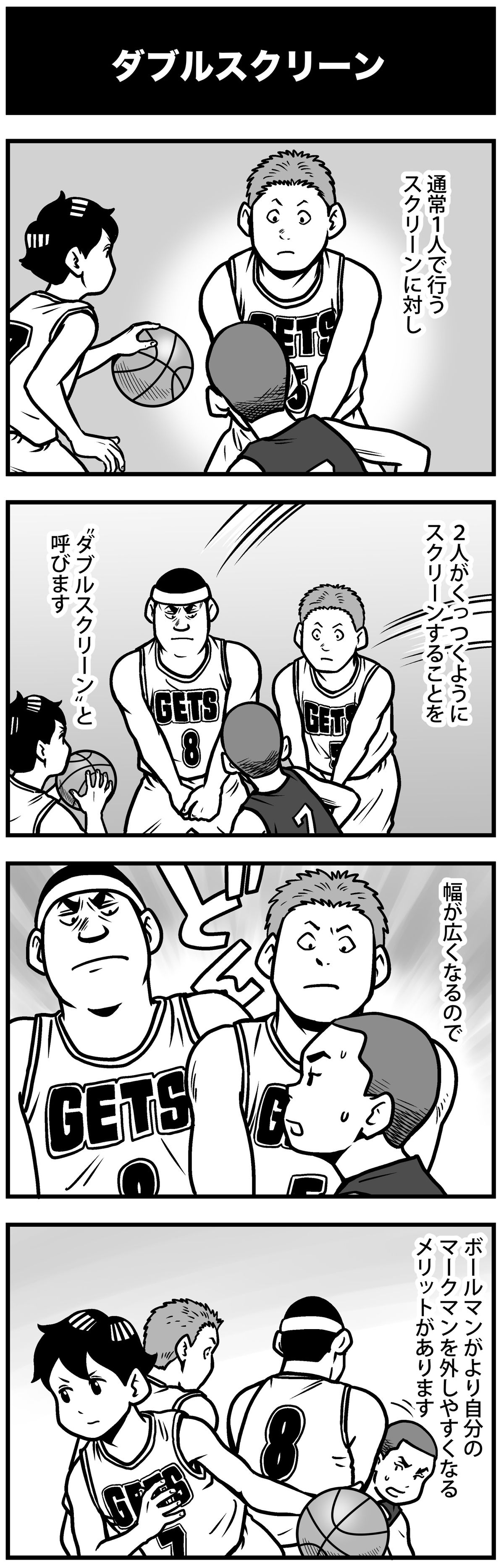 月刊バスケットボールで連載中の『まんが バスケットボール用語辞典』をウェブでも読めるように! 和製英語や造語ではなく、正しい英語のニュアンスで理解していくと、より分かりやすくなる。今回は “ダブルスクリーン”について。