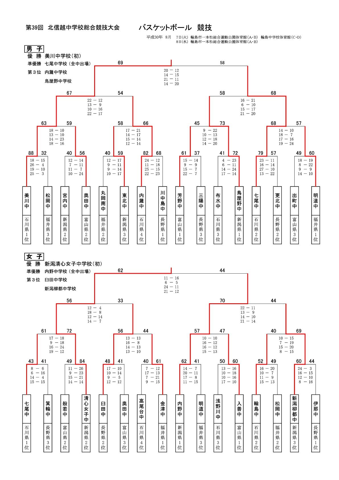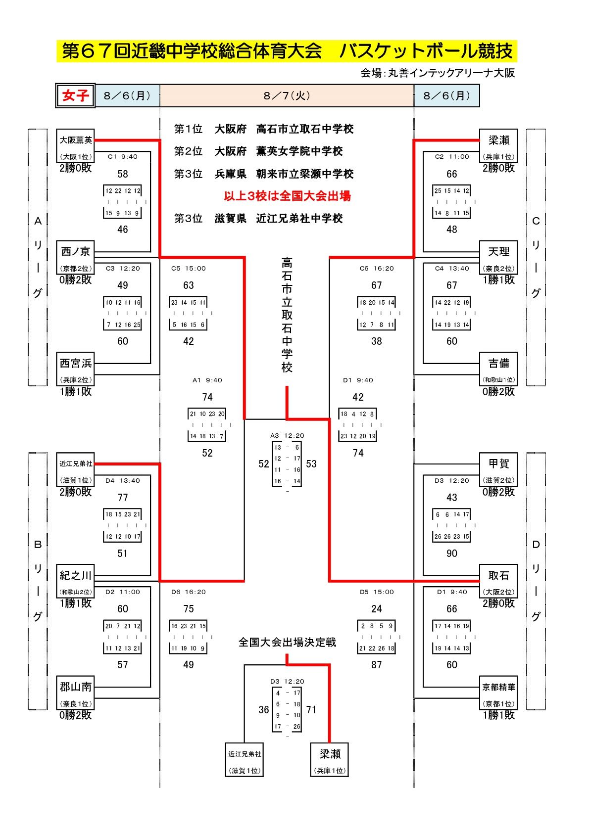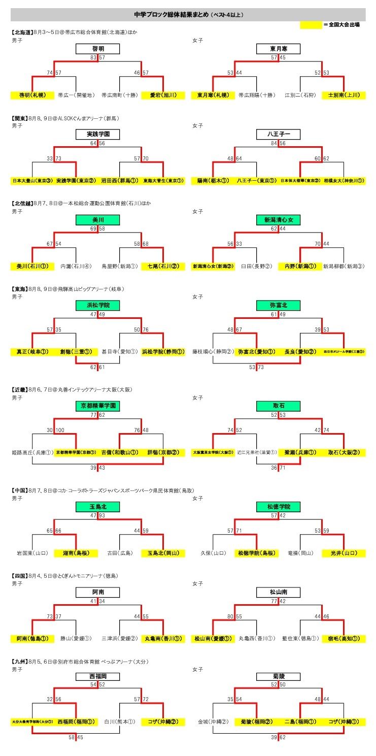 8月6~9日に、北信越(輪島市)と東海(高山市)、近畿(大阪市)、中国ブロック(鳥取市)の中学総体が行われ、8月23日から山口県で開催される“第48回全国中学校バスケットボール大会”への出場チームが決まった。