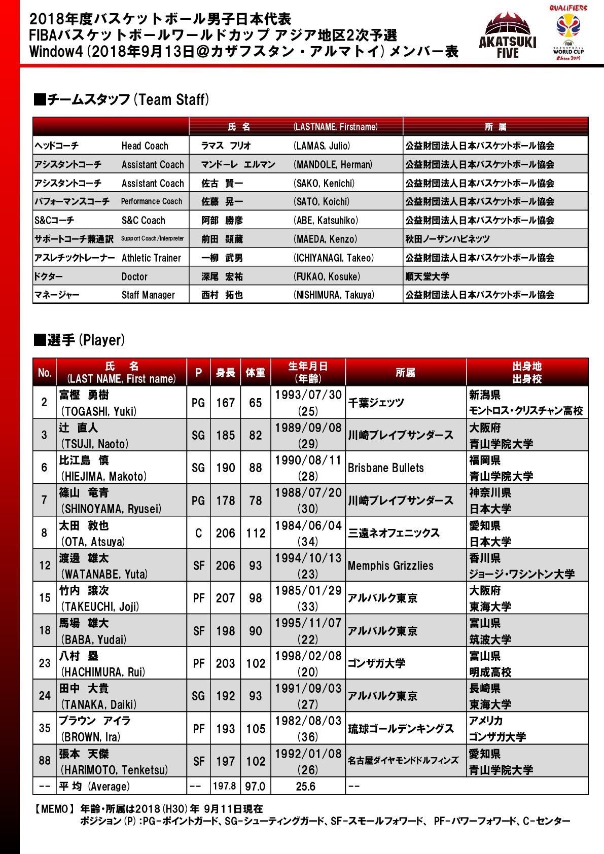 9月13日、男子日本代表チームは、“FIBAワールドカップ2019 アジア地区2次予選の初戦となるカザフスタン戦を迎える。 この大会は、男子日本代表チームにとって、2019年に中国で開催される“FIBAワールドカップ2019”の出場権がかかっているだけでなく、20年の東京オリンピックの出場権獲得にも大きく影響する重要な大会となっている。 Window4のアウェイゲーム、カザフスタン戦の男子日本代表チームのエントリーメンバー12名は下記のとおり。 9月17日のホームゲーム(イラン戦)のエントリーメンバー12名は、9月16日に発表予定。 【選手】 #2 富樫 勇樹(PG/千葉) #3 辻 直人(SG/川崎) #6 比江島 慎(PG/ブリスベン・ブレッツ) #7 篠山 竜青(PG/川崎) #8 太田 敦也(C/三遠) #12 渡邊 雄太(SF/メンフィス・グリズリーズ) #15 竹内 譲次(PF/A東京) #18 馬場 雄大(SF/A東京) #23 八村 塁(SF/ゴンザガ大) #24 田中 大貴(SG/A東京) #35 ブラウン アイラ(PF/琉球) #88 張本 天傑(SF/名古屋D) ※詳しくはJBAホームページへ。 http://fibaworldcup2019-asian.japanbasketball.jp/news/3549 (月刊バスケットボール)