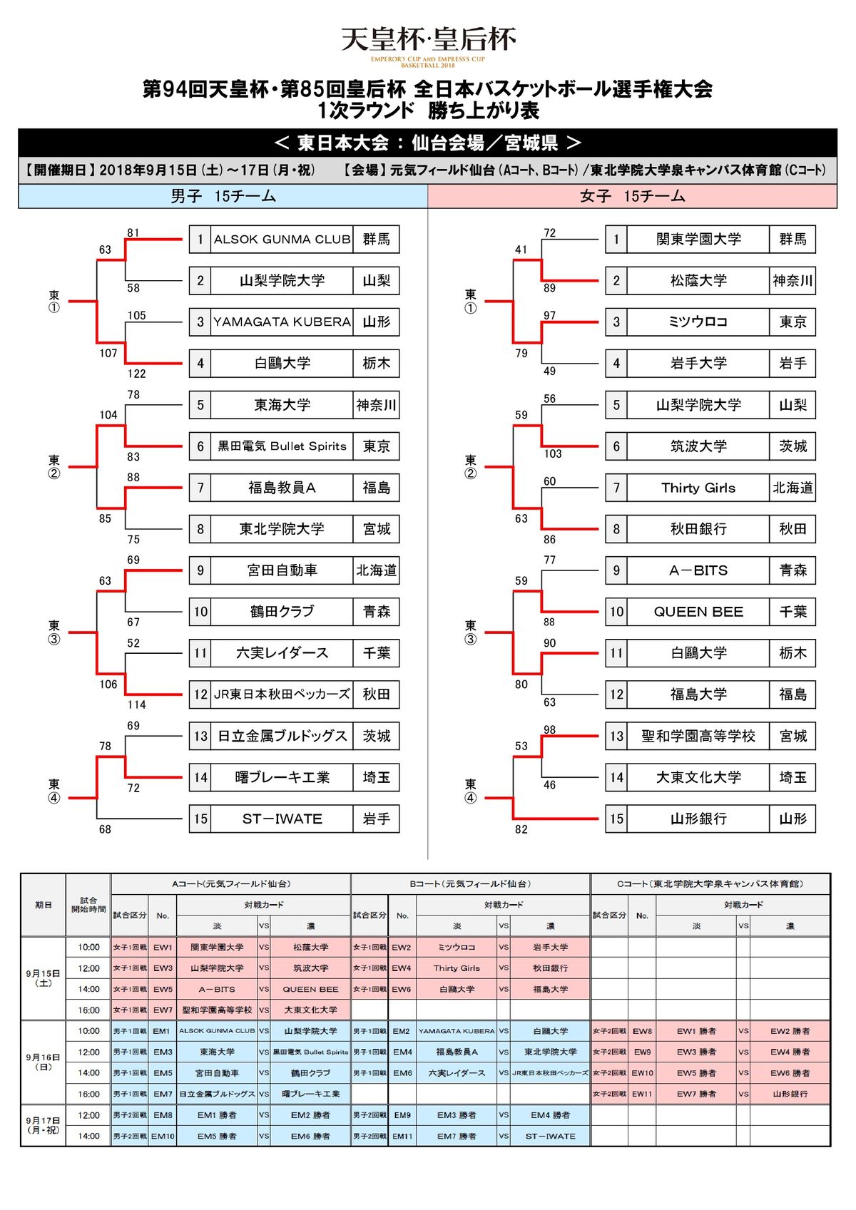 9月15~17日、“第94回天皇杯・第85回皇后杯全日本バスケットボール選手権大会1次ラウンド”が東・中・西日本で行われた。 東日本大会は、元気フィールド仙台・東北学院大泉キャンパス体育館(宮城)、中日本大会は、岐阜メモリアルセンターで愛・ふれ愛ドーム(岐阜)、西日本大会は、キリンビバレッジ周南総合スポーツセンター・メインアリーナ(山口)で開催され、2次予選進出チームは以下のとおり。 ■2次ラウンド進出チーム 【男子】 (全13チーム) 白鷗大(栃木)、黒田電気 Bullet Spirits(東京)、JR東日本秋田ペッカーズ(秋田)、曙ブレーキ工業(埼玉)、京都産大(京都)、天理大(奈良)、リンタツ(愛知)、信和建設(兵庫)、ファイサンズ岡山(岡山)、福岡第一高(福岡)、佐賀BALLOONERS(佐賀)、徳山大(山口)、東海大九州(熊本) 【女子】 (全13チーム) ミツウロコ(東京)、秋田銀行(秋田)、白鷗大(栃木)、山形銀行(山形)、大阪人間科学大(大阪)、滋賀銀行(滋賀)、愛知学泉大(愛知)、岐阜女高(岐阜)、日立笠戸(山口)、高知中央高(高知)、ELEVEN(岡山)、日本経大(福岡)、今治オレンジブロッサム(愛媛)