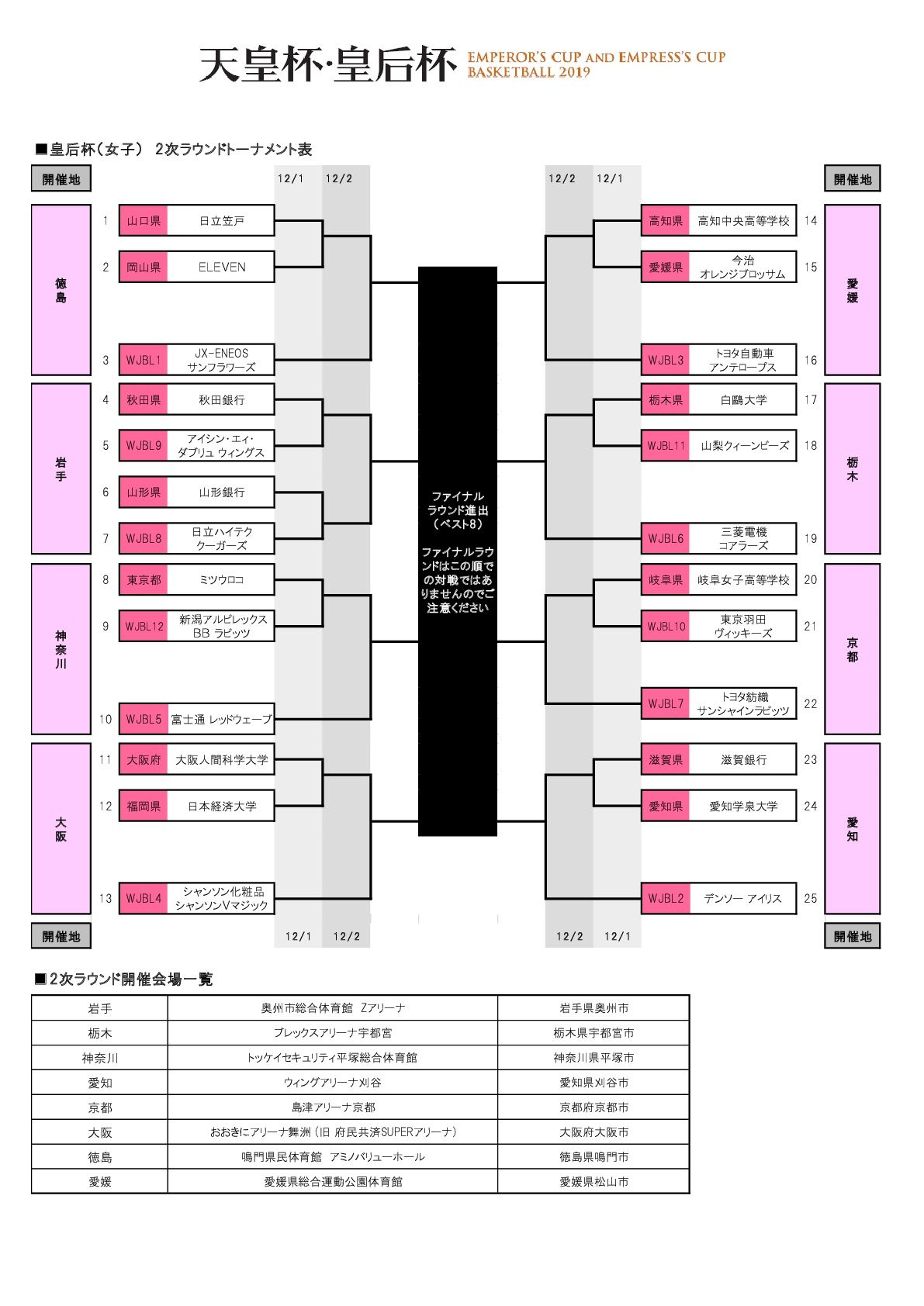 9月19日、1次ラウンドの結果により、12月1、2日に全国8会場で開催される2次ラウンド (男女3~4回戦) の組み合わせが決定した。 2次ラウンドからは男子BリーグのB1、女子Wリーグも出場。なお、各会場の競技日程(試合開始日時)、チケット販売概要は別途、後日発表される。 開業 【出場チーム】 男子:31チーム(1次ラウンド勝ち上がり13チーム+Bリーグ18クラブ。※Bリーグは2017-18シーズンのB1/B2入れ替えの結果を反映する) 女子:27チーム(1次ラウンド勝ち上がり13チーム+Wリーグ12チーム) *男子組み合わせ ※詳しくは大会公式サイトへ。 http://zennihon2018-19.japanbasketball.jp/ (月刊バスケットボール)