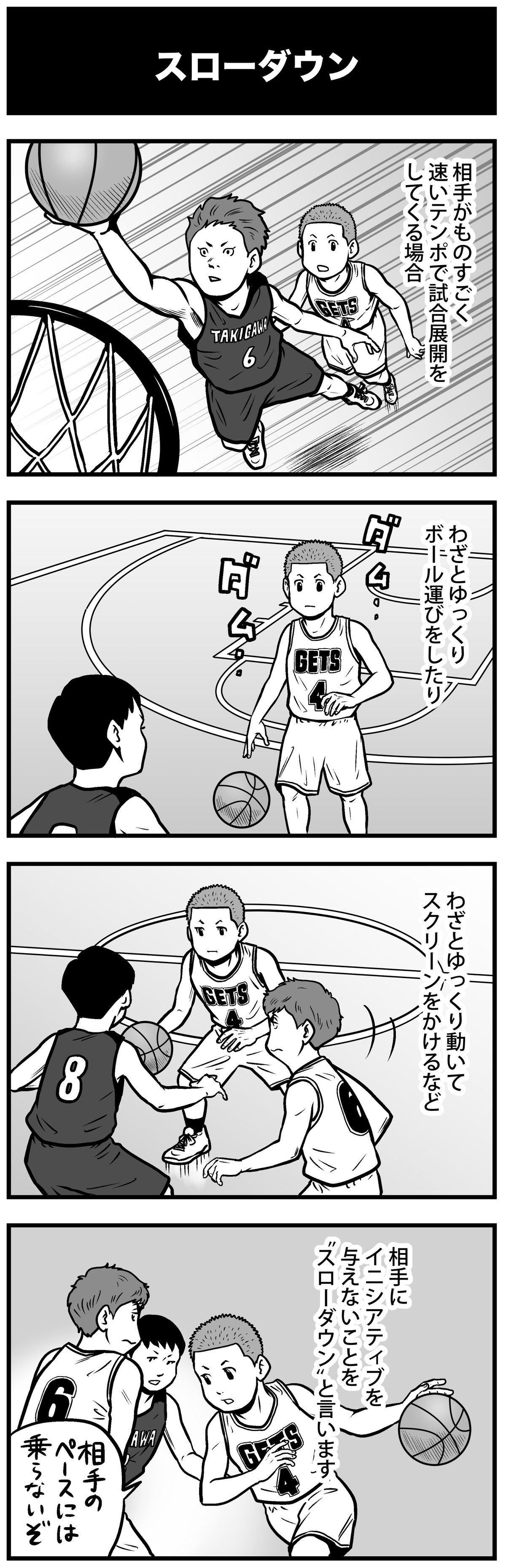 月刊バスケットボールで連載中の『まんが バスケットボール用語辞典』をウェブでも読めるように! 和製英語や造語ではなく、正しい英語のニュアンスで理解していくと、より分かりやすくなる。今回は “スローダウン”について。