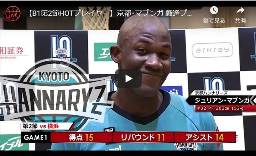 Bリーグ2018-19全試合配信の“バスケットLIVE”では、各節のHOTなプレイヤーをピックアップして、その選手のプレー集を配信しています。 10/11(木)~10/14(日)に開催されたB1第2節からは、横浜ビー・コルセアーズとの試合でGAME1はトリプルダブル、GAME2ではB1タイ記録の16アシストを達成したジュリアン・マブンガ(京都ハンナリーズ)が選ばれました。