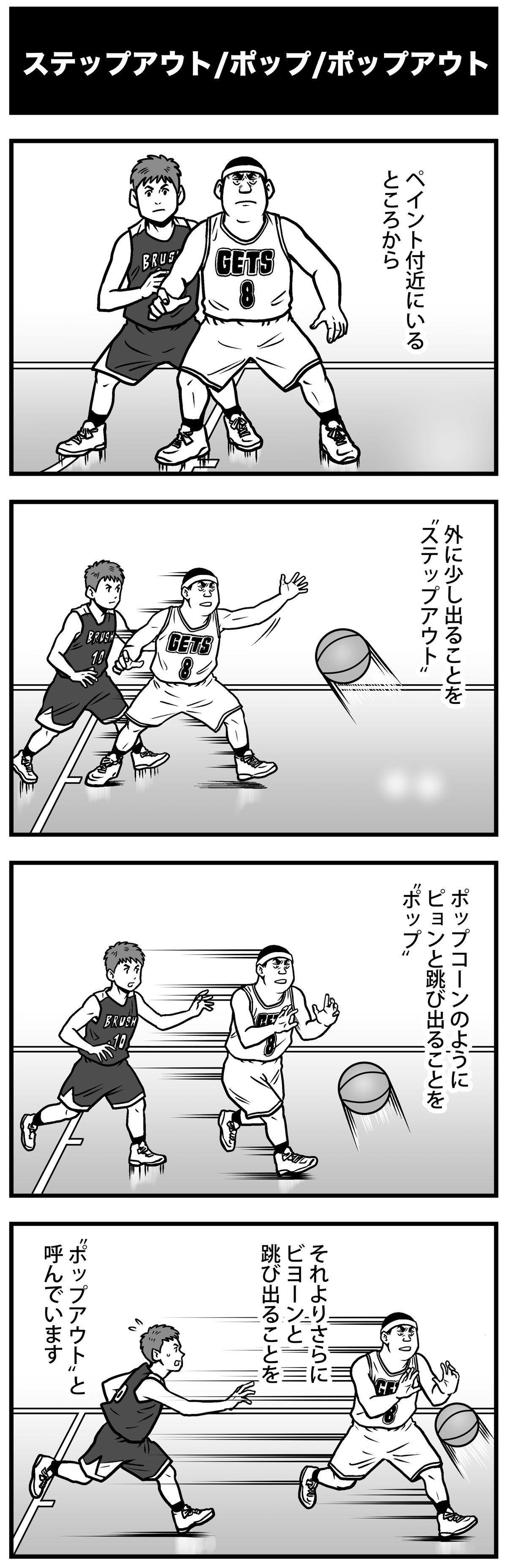 月刊バスケットボールで連載中の『まんが バスケットボール用語辞典』をウェブでも読めるように! 和製英語や造語ではなく、正しい英語のニュアンスで理解していくと、より分かりやすくなる。今回は “ステップアウト”“ポップ”“ポップアウト”について。