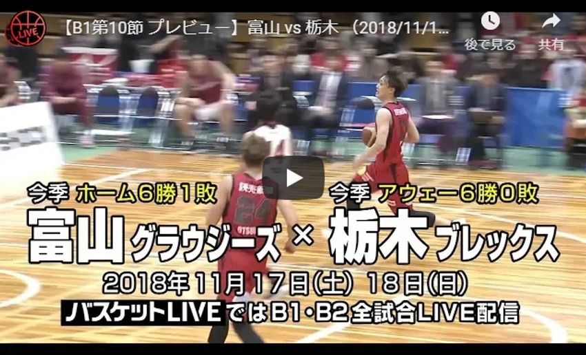11月16日(金)から18日(日)にかけて行われるB1リーグの第10節。 今節の対戦カードからは、1試合平均得点がリーグ1位と2位の対決となる『富山vs.栃木』の試合をピックアップする。 レオ・ライオンズやジョシュア・スミスを中心とした圧倒的な攻撃力で好調をキープする富山。一方、リーグ2位の得点力を誇る攻撃と経験豊富なメンバーによる堅守で東地区首位を走る栃木。 互いの武器を最大限に生かした攻め合いか? もしくは予想に反してロースコアゲームになるのか? 上位チーム同士による注目の戦いは、11.17(土)18:05と11.18(日)13:05に富山市総合体育館でティップオフ!! https://www.youtube.com/watch?v=NBk-DsdSO0Q <B.LEAGUE 2018-19/B1リーグ第10節> 2018年11月17日(土)18:05ティップオフ@富山市総合体育館2018年11月18日(日)13:05ティップオフ@富山市総合体育館富山グラウジーズ vs. 栃木ブレックス 【“Bリーグ2018-19全試合配信”バスケットLIVE】 https://basketball.mb.softbank.jp/?utm_source=partner&utm_medium=basketball-zine&utm_campaign=006 (月刊バスケットボール)