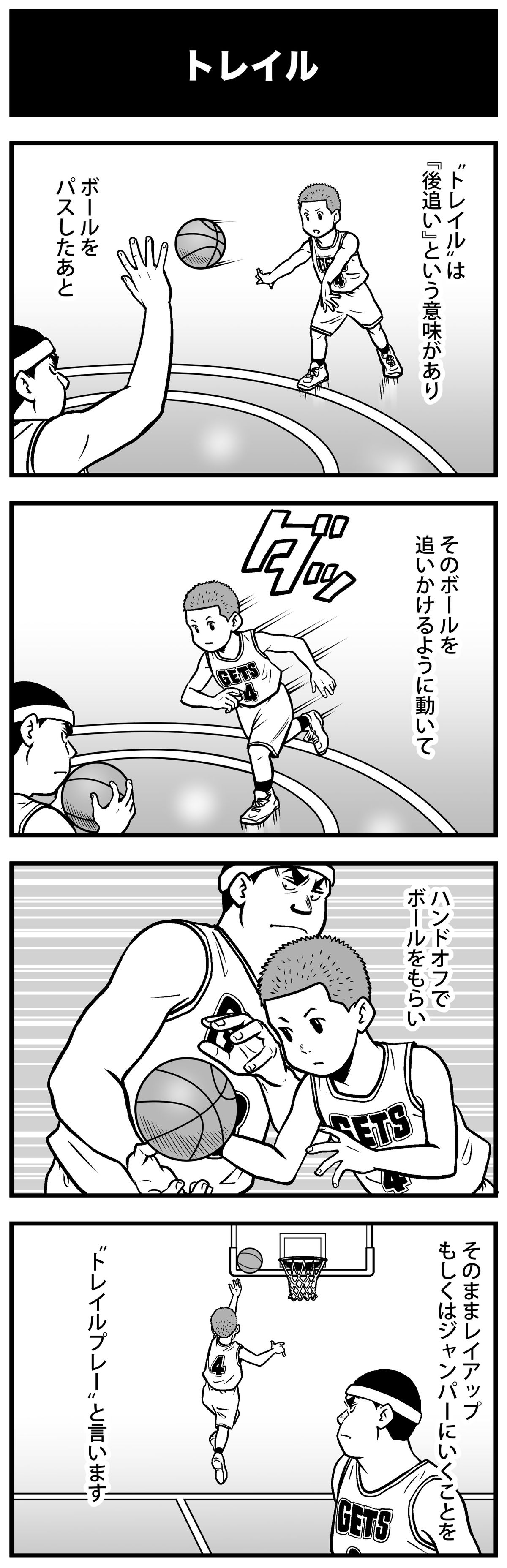 月刊バスケットボールで連載中の『まんが バスケットボール用語辞典』をウェブでも読めるように! 和製英語や造語ではなく、正しい英語のニュアンスで理解していくと、より分かりやすくなる。今回は “トレイルプレー”について。