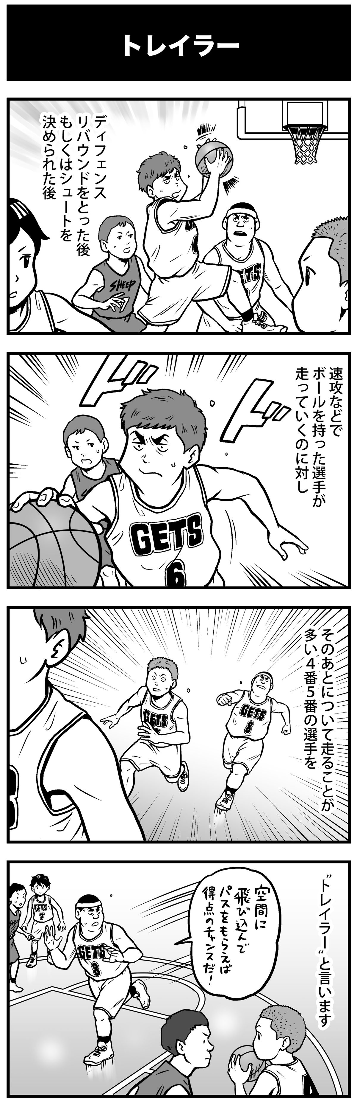 月刊バスケットボールで連載中の『まんが バスケットボール用語辞典』をウェブでも読めるように! 和製英語や造語ではなく、正しい英語のニュアンスで理解していくと、より分かりやすくなる。今回は “トレイラー”について。