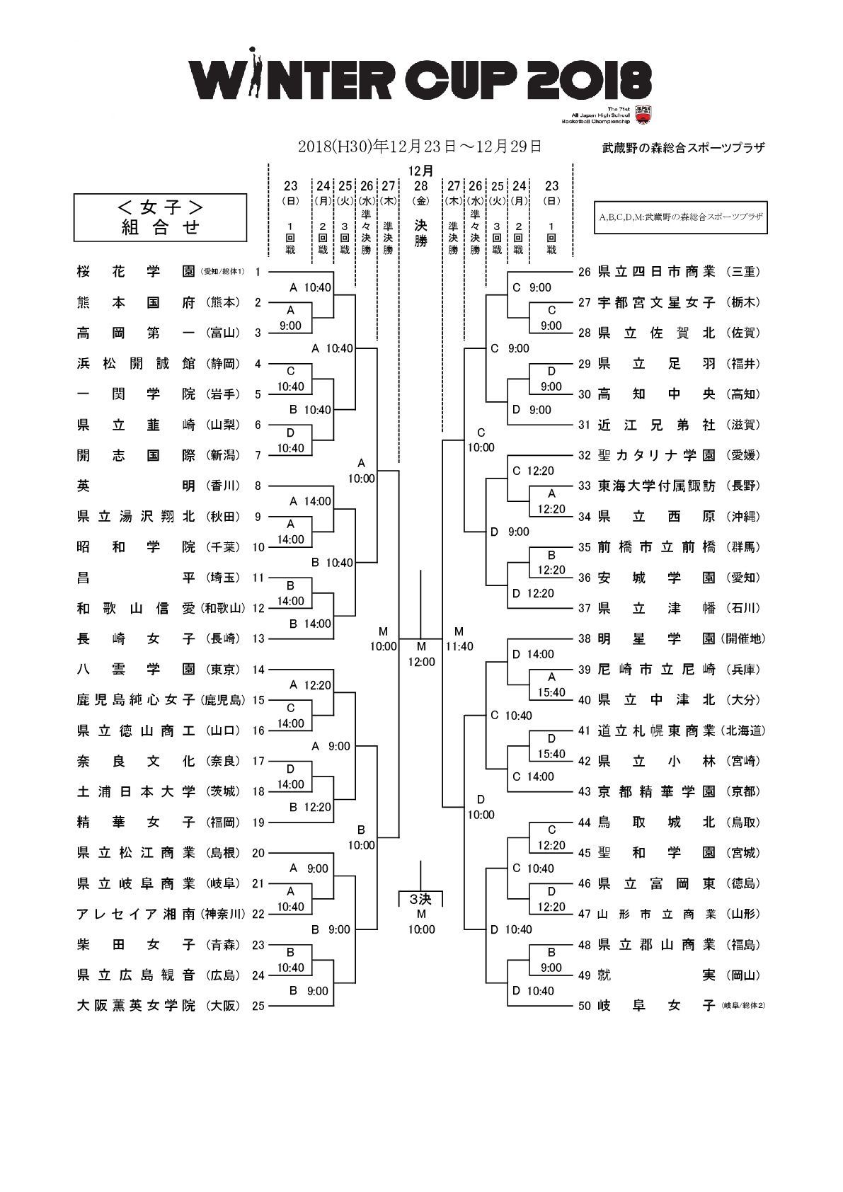 12月23~29日に、武蔵野の森総合スポーツプラザ(東京)で開催されるウインターカップ2018(第71回全国高校バスケットボール選手権大会)の男女組み合わせが決定した。