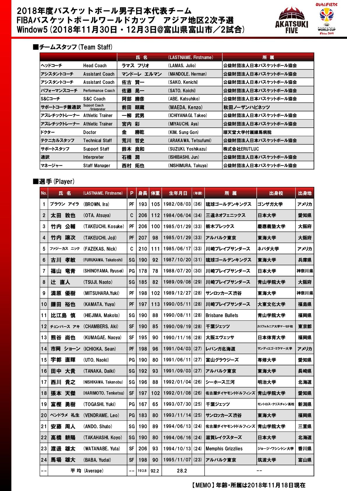 11月30日(金)より「FIBAバスケットボールワールドカップ2019アジア地区2次予選」Window5がスタートする。 11月30日、12月3日(月)の両日には、日本のホームゲーム2連戦となるカタール戦(12/3)、カザフスタン戦(12/3) が、いずれも富山市総合体育館にて開催される。Window5に向けた「AKATSUKI FIVE」バスケットボール男子日本代表チーム日本代表候補選手(予備登録メンバー)24名は以下のとおり。 Window5の最終メンバー12名の決定については、今回発表した予備登録メンバー24名から選出され、メンバー12名の正式発表は各試合の前日夜、代表者会議終了後となる。 ブラウン アイラ(PF/琉球ゴールデンキングス) 太田 敦也(C/三遠ネオフェニックス) 竹内 公輔(PF/栃木ブレックス) 竹内 譲次(PF/アルバルク東京) ファジーカス ニック(C/川崎ブレイブサンダース) 古川 孝敏(SG/琉球ゴールデンキングス) 篠山 竜青(PG/川崎ブレイブサンダース) 辻 直人(SG/川崎ブレイブサンダース) 満原 優樹(PF/サンロッカーズ渋谷) 鎌田 裕也(PF/川崎ブレイブサンダース) 比江島 慎(SG/ブリスベン・ブレッツ) チェンバース アキ(SF/千葉ジェッツ) 熊谷 尚也(SF/大阪エヴェッサ) 市岡 ショーン(PF/レバンガ北海道) 宇都 直輝(PG/富山グラウジーズ) 田中 大貴(SG/アルバルク東京) 西川 貴之(SG/シーホース三河) 張本 天傑(SF/名古屋ダイヤモンドドルフィンズ) 富樫 勇樹(PG/千葉ジェッツ) ベンドラメ 礼生(PG/サンロッカーズ渋谷) 安藤 周人(SG/名古屋ダイヤモンドドルフィンズ) 高橋 耕陽(SG/滋賀レイクスターズ) 渡邊 雄太(SF/メンフィス・グリズリーズ) 馬場 雄大(SF/アルバルク東京) *所属は2018年11月18日現在 ※詳しくはJBAホームページへ。 http://fibaworldcup2019-asian.japanbasketball.jp/japan/3603 (月刊バスケットボール)