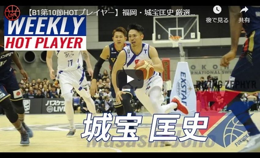 Bリーグ2018-19全試合配信の“バスケットLIVE”では、各節のHOTなプレイヤーをピックアップして、その選手のプレー集を配信しています。 11月16日(金)から18日(日)に開催されたB1第10節からは、初のB1に挑んでいるライジングゼファー福岡から、36歳のベテランシューター・城宝匡史が選ばれました。