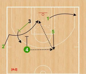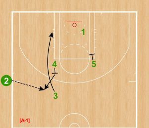 [A-1] ②がインバウンダー、④と⑤がハイポスト、③が2ガードトップ、①が右ローポスト付近に立って、このプレーはスタートする。 ③は④のバックスクリーンを使ってペイント内へカット。④はアフタースクリーンでポップアウトして②からのパスをレシーブする。①は右コーナーへ動き、インサイドのスペースを空ける。
