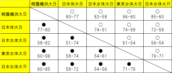 1位 桐蔭横浜大B 2位 日本体大B 3位 日本女体大B 4位 東京女体大B 5位 日本女体大R(レフリー)