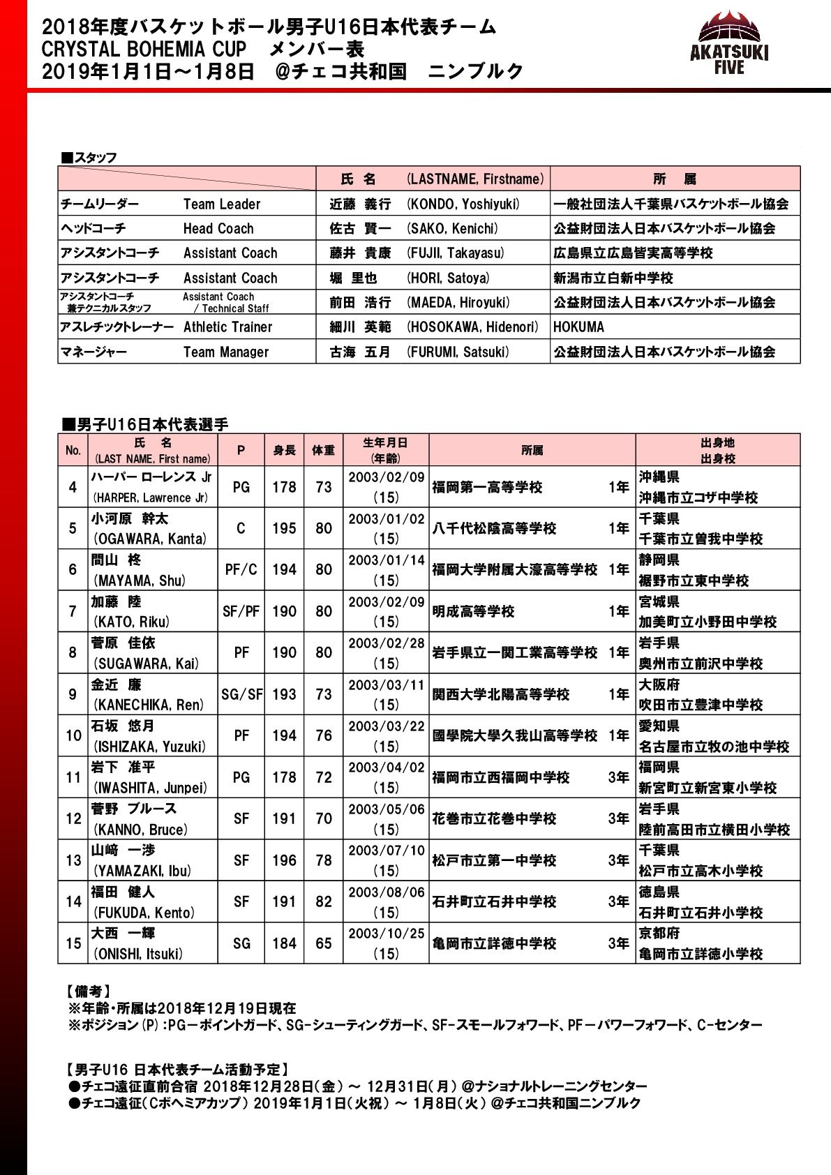 1月1日からチェコ遠征を行っていた“男子U16日本代表チーム”が、1月8日に帰国。現地で参加した『クリスタル・ボヘミアカップ』で見事に優勝し、昨年に続いて2連覇を達成した。 190cm台の選手を9人(小河原195cm、間山194cm、加藤190cm、菅原190cm、金近193cm、石坂194cm、菅野191cm、山﨑196cm、福田191cm)そろえ、オールラウンダーとしてコンバートさせて臨んだ今大会。大会ベスト5には山﨑一渉(SF / 松戸一中3年)と岩下准平(PG / 西福岡中3年)が選出され、さらに岩下はMVPにも選ばれた。 本番となる“FIBA U16アジア選手権大会(期日・開催地未定)”に向け、幸先の良いスタートを切ったと言える。 *遠征メンバー (月刊バスケットボール)