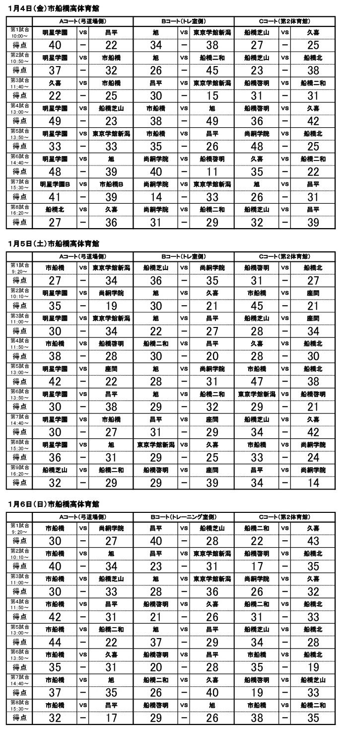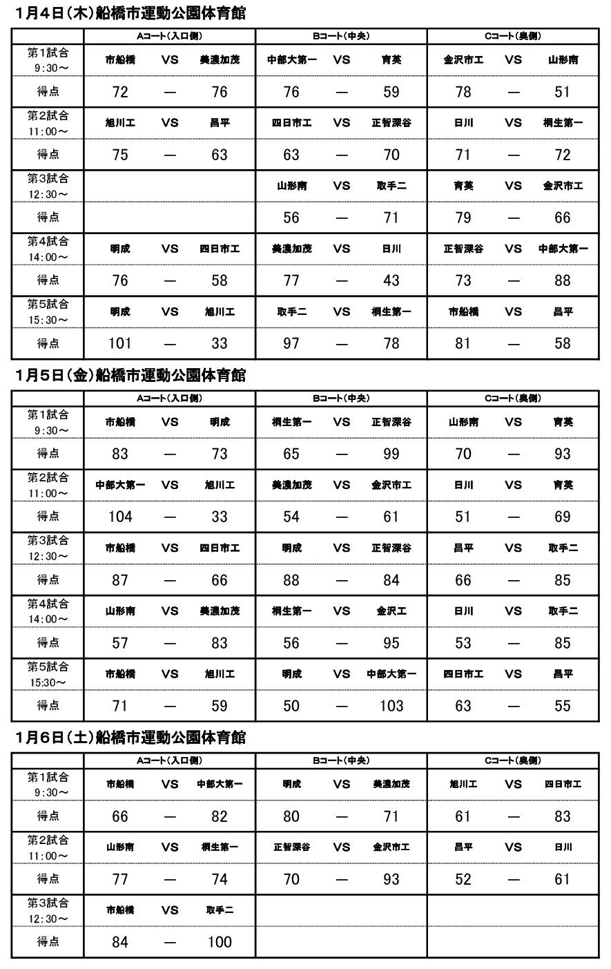 1月4~6日、船橋市運動公園体育館、市船橋高(千葉)で“第24回千葉ジェッツふなばしカップバスケットボール大会”が開催された。 男子は中部大第一(愛知)や明成(宮城)、市船橋など14チーム、女子は市船橋や明星学園(東京)など11チームが参加。 男子は中部大第一と取手二(茨城)が5勝0敗の無傷で1位。女子は市船橋が1位となった。順位と試合結果は以下のとおり。 ≪男子順位≫ 1位…中部大第一(愛知) 1位…取手二(茨城) 3位…金沢市工(石川) 4位…明成(宮城) 5位…市船橋(千葉) 6位…育英(兵庫) 7位…美濃加茂(岐阜) 8位…正智深谷(埼玉) 8位…四日市工(三重) 10位…桐生第一(群馬) 10位…山形南(山形) 10位…日川(山梨) 10位…旭川工(北海道) 14位…昌平(埼玉) ≪女子順位≫ 1位…市船橋(千葉) 2位…明星学園(東京) 3位…東京学館新潟(新潟) 4位…昌平(埼玉) 5位…久喜(埼玉) 6位…尚絅学院(宮城) 7位…船橋芝山(千葉) 8位…旭(神奈川) 9位…船橋二和(千葉) 10位…船橋啓明(千葉) 11位…船橋北(千葉)