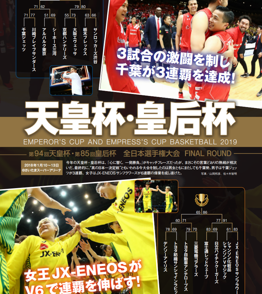 1月10~13日、さいたまスーパーアリーナで繰り広げられた今年の天皇杯・皇后杯ファイナルラウンド。大会のキャッチフレーズは『心に響く、一発勝負。』だったが、まさにこの言葉どおりの熱戦が相次いだ。 ハードな戦いを勝ち抜いて優勝を手にしたのは、またしても千葉勢。天皇杯は千葉が初戦から大接戦を切り抜けて3連覇、皇后杯はJX-ENEOSが他チームの挑戦を退けて6連覇を達成した。 今月号ではそんな優勝チームの道のりや大会総括、そして2019年が年男・年女になる馬場雄大(A東京)、宮崎早織(JX-ENEOS)のスペシャルインタビューを掲載! プライベートも含めた昨年の振り返りや新年の抱負などファン必読の内容だ。 (月刊バスケットボール)