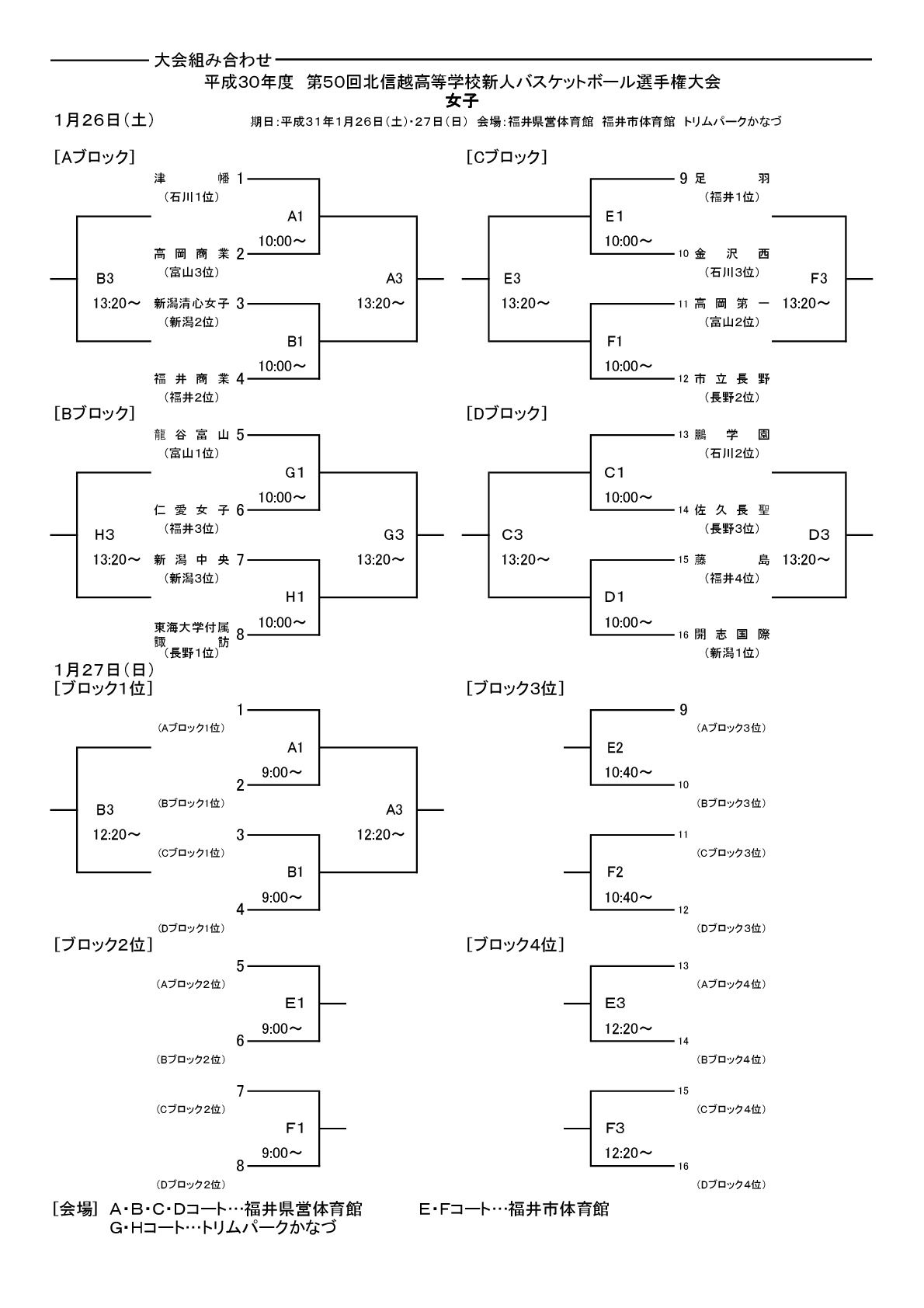 1月26~27日に県営体育館、福井市体育館、トリムパークかなづ(福井)で開催される“第50回北信越高校新人バスケットボール選手権大会”の組み合わせは以下のとおりとなった。   試合はブロック別のトーナメント戦で、勝者戦・敗者戦を実施後、ブロック別の順位を決定。2日目は1日目の結果により、上位4チームは2試合行って順位を決定する。   ★男子