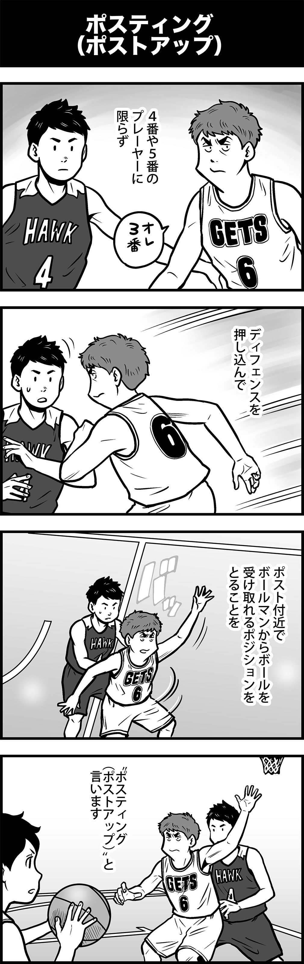 月刊バスケットボールで連載中の『まんが バスケットボール用語辞典』をウェブでも読めるように! 和製英語や造語ではなく、正しい英語のニュアンスで理解していくと、より分かりやすくなる。今回は “ポスティング”について。