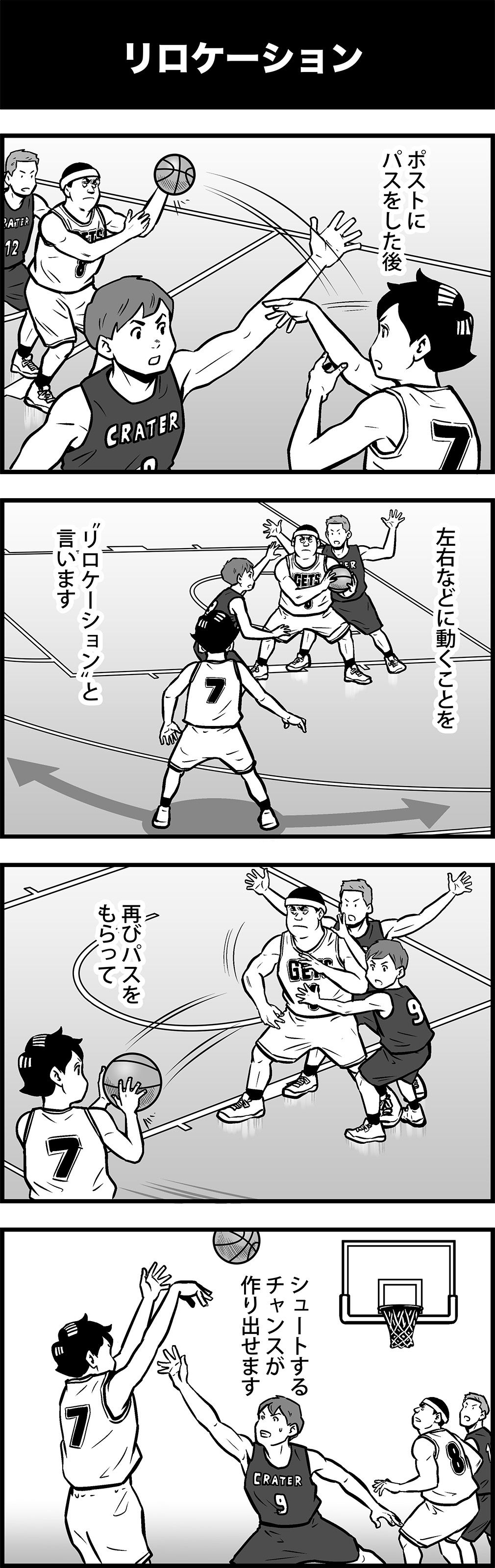 月刊バスケットボールで連載中の『まんが バスケットボール用語辞典』をウェブでも読めるように! 和製英語や造語ではなく、正しい英語のニュアンスで理解していくと、より分かりやすくなる。今回は“リロケーション” と、その活用法について。   解説=倉石 平 漫画=西村友宏
