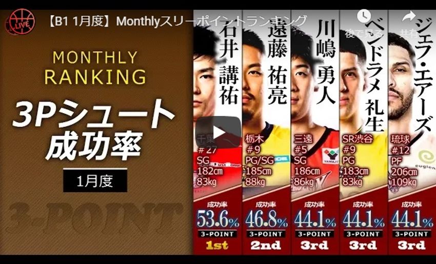 【動画あり】B1/2019年1月度『得点&アシスト&3Pシュートランキング』