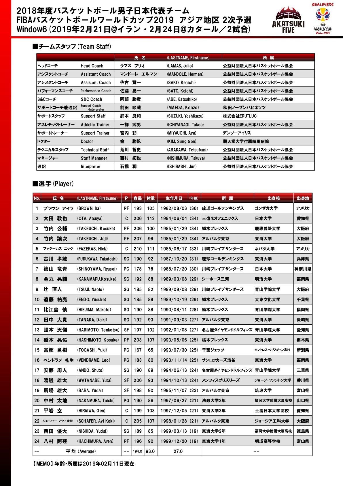 2月21日から始まる“FIBAバスケットボールワールドカップ2019 アジア地区2次予選”Window6(2月21日/vs.イラン、2月24日/vs.カタール)の男子日本代表チームの予備登録メンバー24名が決定した。