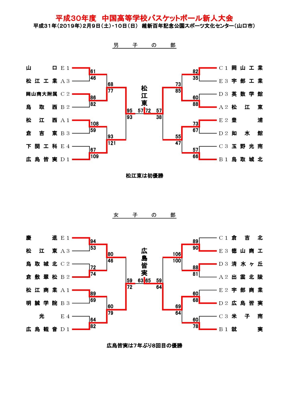 2月9、10日に “平成30年度中国高校バスケットボール新人大会”が維新百年記念公園スポーツ文化センター(山口)で行われた。   男子は松江東(島根)が岡山商科大附(岡山)を72-57で破って初優勝。女子は広島県勢の決勝となり、広島皆実(広島)が65-63の僅か2点差で広島観音を振り切った。   ≪試合結果≫