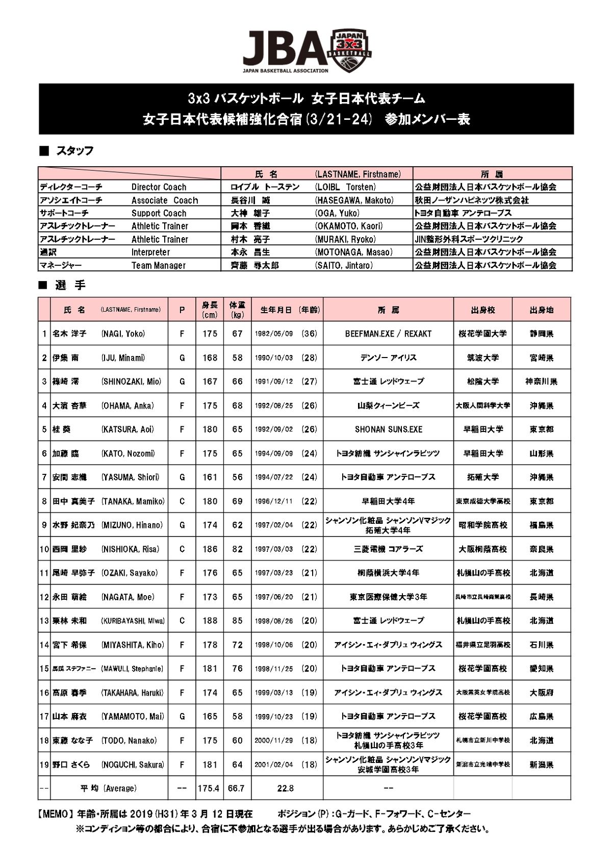 3月21~24日の4日間、味の素ナショナルトレーニングセンター (東京)で実施する3×3女子日本代表候補強化合宿の参加メンバーが以下のように決定した。