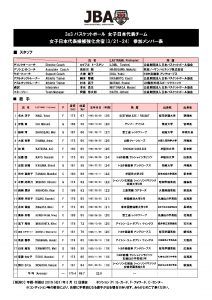 【選手】 名木 洋子(F/BEEFMAN.EXE/REXAKT) 伊集 南(G/デンソー) 篠崎 澪(G/富士通) 大濱 杏華(F/山梨) 桂 葵(F/SHONAN SUNS.EXE) 加藤 臨(F/トヨタ紡織) 安間 志織(G/トヨタ自動車) 田中 真美子(C/早稲田大4年) 水野 妃奈乃(G/シャンソン化粧品/ 拓殖大4年) 西岡 里紗(C/三菱電機) 尾崎 早弥子(F/桐蔭横浜大4年) 永田 萌絵(F/東京医療保健大3年) 栗林 未和(C/富士通) 宮下 希保(F/アイシンAW) 馬瓜 ステファニー(F/トヨタ自動車 ) 高原 春季(F/アイシンAW) 山本 麻衣(G/トヨタ自動車) 東藤 なな子(F/トヨタ紡織/札幌山の手高3年) 野口 さくら(F/シャンソン化粧品/安城学園高3年) ※所属は3月12日現在