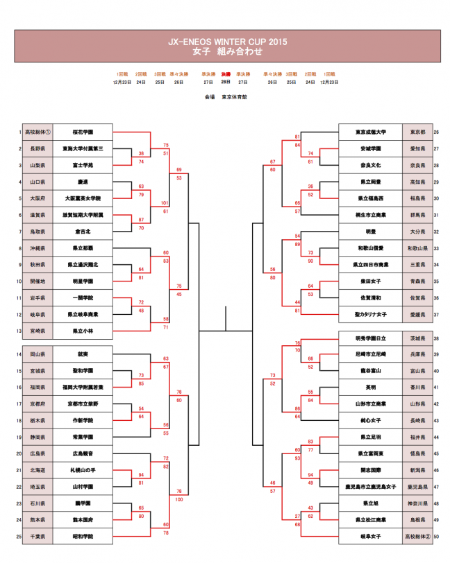 ◯明星学園75−45小林● ◯桜花学園69−53大阪薫英女学院● ◯岐阜女57−46開志国際● ◯聖カタリナ女80−56四日市商● 男子勝ち上がり表