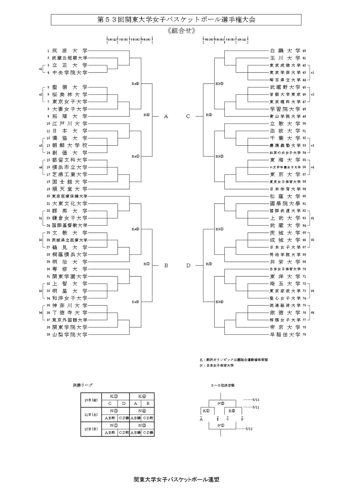4月27日~5月12日までの2週間、“第53回関東大学女子バスケットボール選手権大会”を駒沢オリンピック公園総合運動場体育館(東京)ほかで開催する。 シード校32チーム以外はグループによるリーグ戦を行い、その後トーナメント方式でベスト4までを決定。最終3日間でベスト4による決勝リーグと5~8位の順位決定戦を行う。 *組み合わせ
