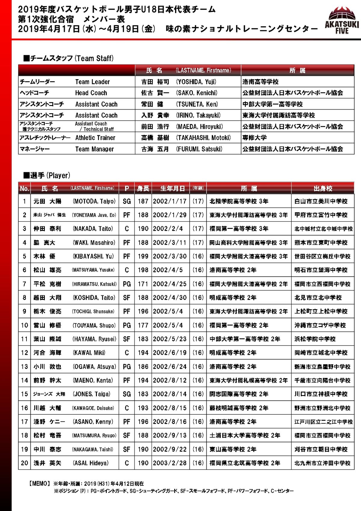 2019年度“男子U18日本代表チーム”第1次強化合宿参加選手20名発表
