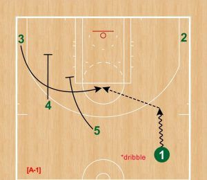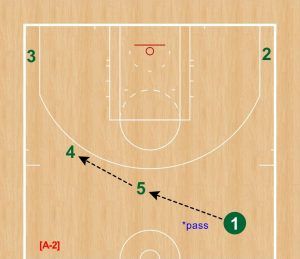 ④・⑤は左コーナーの③へスタッガードスクリーンをセットし、③はディフェンスの状況を見てカット。ドリブルキャリーしている(これが合図の一種)①からのパスをレシーブしてシュートを放つ(カットの方法やスクリーンはさまざまなオプションがあり、コート図にあるのは一部の基本パターン)。