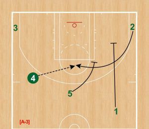 ①と⑤が右コーナーの②へスクリーンを仕掛けると、[A-1]とは左右逆のオフェンスになっていく。