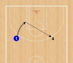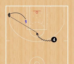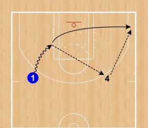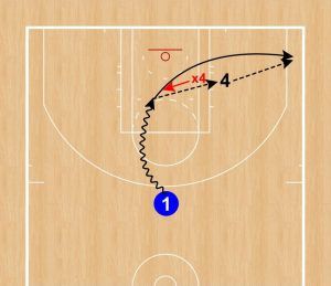 トップから左方向へドライブし、右ミドルポストへディッシュパスした場合(ミドルポストにいる④のディフェンスX4がヘルプ)、右コーナーへリロケートして3Pシュートを狙う。