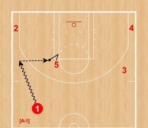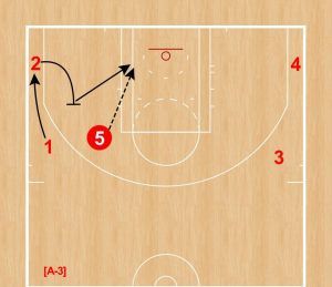 ②が①へバックスクリーンを仕掛けるパターン。①はコーナーへ、②はアフタースクリーンでリング方向へカットし、⑤からのパスをレシーブする。