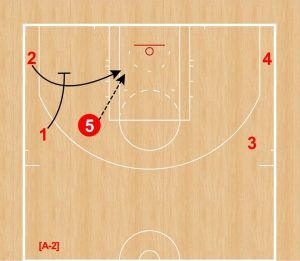 ①はギブ&ゴーで②へダウンスクリーン。②はカールカットし、⑤からパスをレシーブしてシュートを放つ。