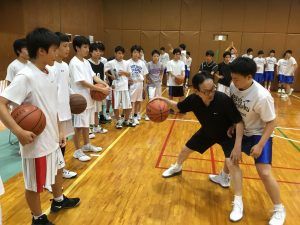 中学生をガード陣とフォワード陣に分け、ガードではスペーシングをフォワードはポストプレーのフットワークを中心に精力的に指導した。