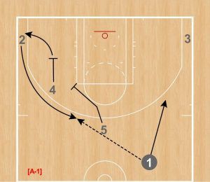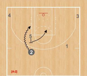 ②がシュートできなかった場合、⑤がそのまま②へフラットスクリーンを仕掛けて2メンゲームを行う。②は自分のドライブ、⑤のスクリーンロールへのパスを狙う。④が反対サイドへクリアアウトするパターンもある。